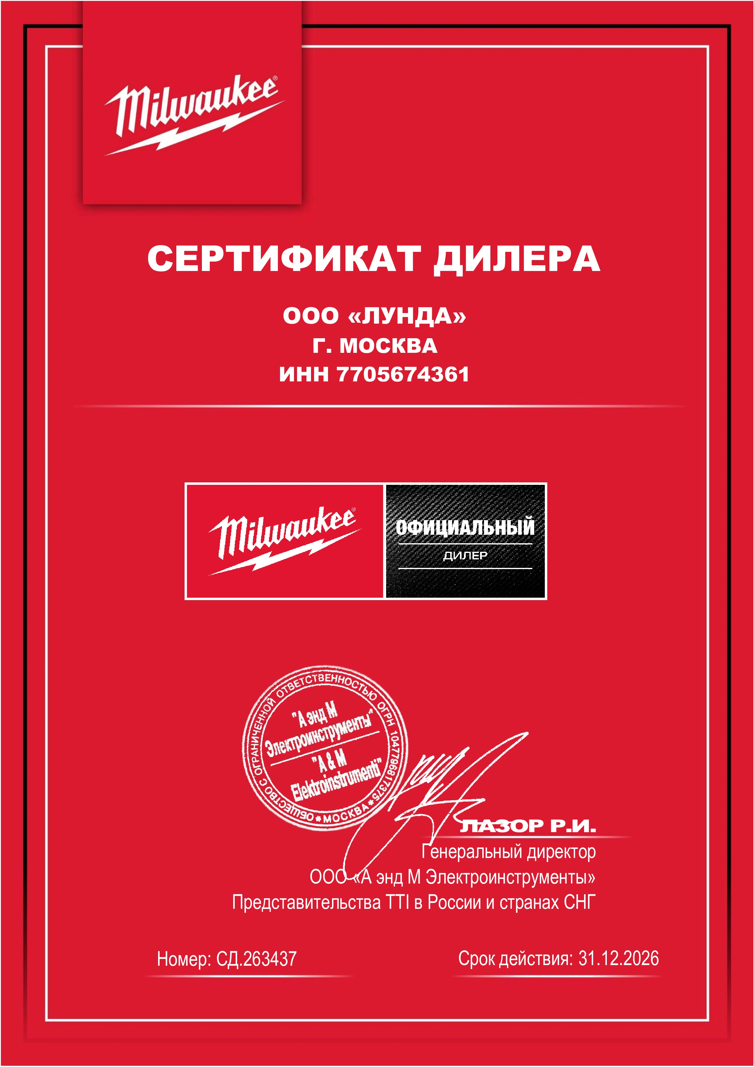 ООО «Лунда» является сертифицированным дилером по продаже электроинструмента и принадлежностей торговой марки Milwaukee.